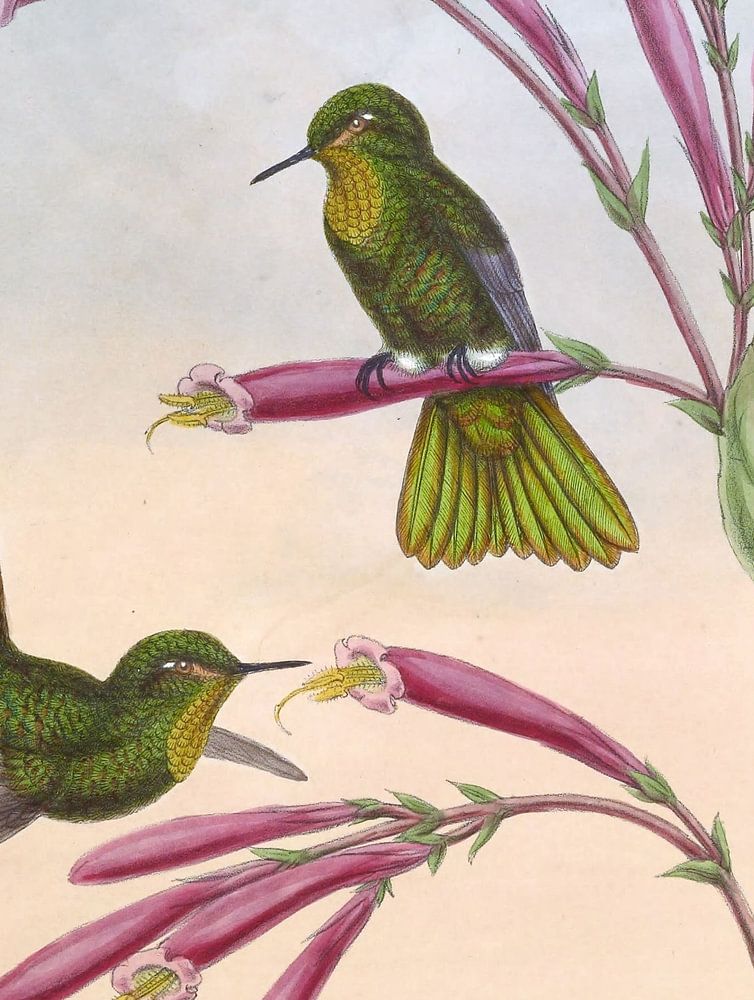 Jelskis Kupferschwanz (Metallura Jelskii / Heterocerca), John Gould Diese Art wurde in Peru von dem berühmten polnischen Reisenden entdeckt, dessen Name er trägt und von dem er in den hohen Bergen in der Nähe des Junin -Sees zwischen Gucas und Payeamayo getroffen wurde. Diese Illustration wurde in ihre ursprüngliche Lebendigkeit wiederhergestellt, indem die Farben verstärkt und unerwünschte Markierungen entfernt werden. Eine Monographie der Trochilidæ oder der Familie von Kolibris wurde zwischen 1849 und 1887 vom englischen Ornithologen John Gould veröffentlicht. Diese monumentale Arbeit zeigt und beschreibt alle bekannten Arten von Kolibris zu dieser Zeit - mit 418 lithografischen Platten und Informationen zu 537 Arten. "