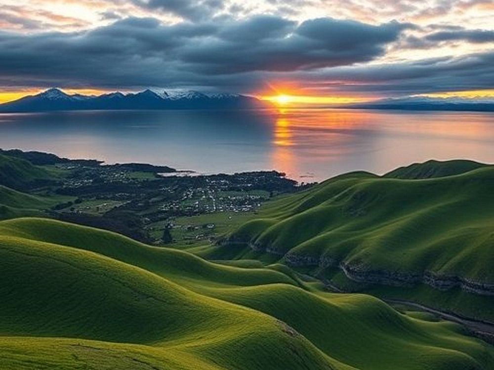 Dieses atemberaubende Kunstwerk fängt die ruhige Schönheit eines Sonnenuntergangs über einem großen See ein, eingerahmt von sanften, grünen Hügeln im Vordergrund. Der Himmel ist eine Leinwand aus dramatischen Wolken, gemalt mit den warmen Farbtönen der untergehenden Sonne, die einen goldenen Weg über das Wasser wirft. In der Ferne erheben sich majestätische Berge, deren Gipfel sich gegen den hellen Horizont abzeichnen. Am Rande des Sees liegt ein charmantes Dorf mit vereinzelten Lichtern, die der ansonsten unberührten Landschaft einen Hauch von menschlicher Präsenz verleihen. Die üppigen, grünen Hügel lenken den Blick auf das weite Wasser und laden zur Kontemplation und zu einem Gefühl der friedlichen Flucht ein. Dieses Werk weckt Gefühle der Gelassenheit, der Ehrfurcht und der tiefen Schönheit der Natur, die es umarmt.
