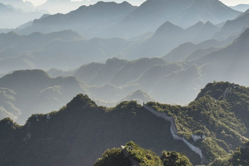 Die gewundene Chinesische Mauer in den nordchinesischen Bergen mit ihren endlosen Ausblicken.