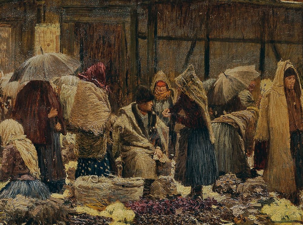 Bestelle diese Malerei Johann Nepomuk Geller, Marktmotiv auf der Haide, um 1900 von Atelier Liesjes als Reproduktion auf Leinwand, Alu-Dibond, als Poster, Fototapete oder Acrylglasbild.