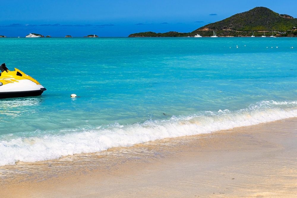 Jolly Beach ein Strand in Antigua in der Karibik mit azurblauem Meer und einem Jetski