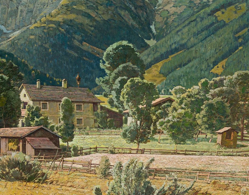 Gemälde einer Frühlingslandschaft, in der ein Tal mit einem Bauernhof und einem Haus zwischen den Bergen liegt, während neben einem plätschernden Gebirgsfluss Grünzeug sprießt. Der Fluss ist seicht und die Steine ragen aus dem Wasser.