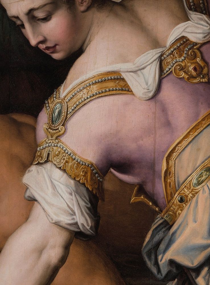 Die kräftigen Arme und die angewinkelten Schultern dieser biblischen Heldin erzeugen lebhafte diagonale Linien, die ihre übertriebene Muskulatur betonen. Judith kam zur Rettung, als General Holofernes und das assyrische Heer ihre Stadt Bethulia belagerten. Judith drang mutig in das assyrische Lager ein, speiste mit Holofernes und enthauptete ihn, nachdem er betrunken war, mit Hilfe ihrer Magd Abra. In einer Pose, die Michelangelos Deckengemälde der Sixtinischen Kapelle nachempfunden ist, stellt Giorgio Vasari Judith als eine körperlich starke Frau dar, ein sichtbares Zeichen für ihren inneren Mut.