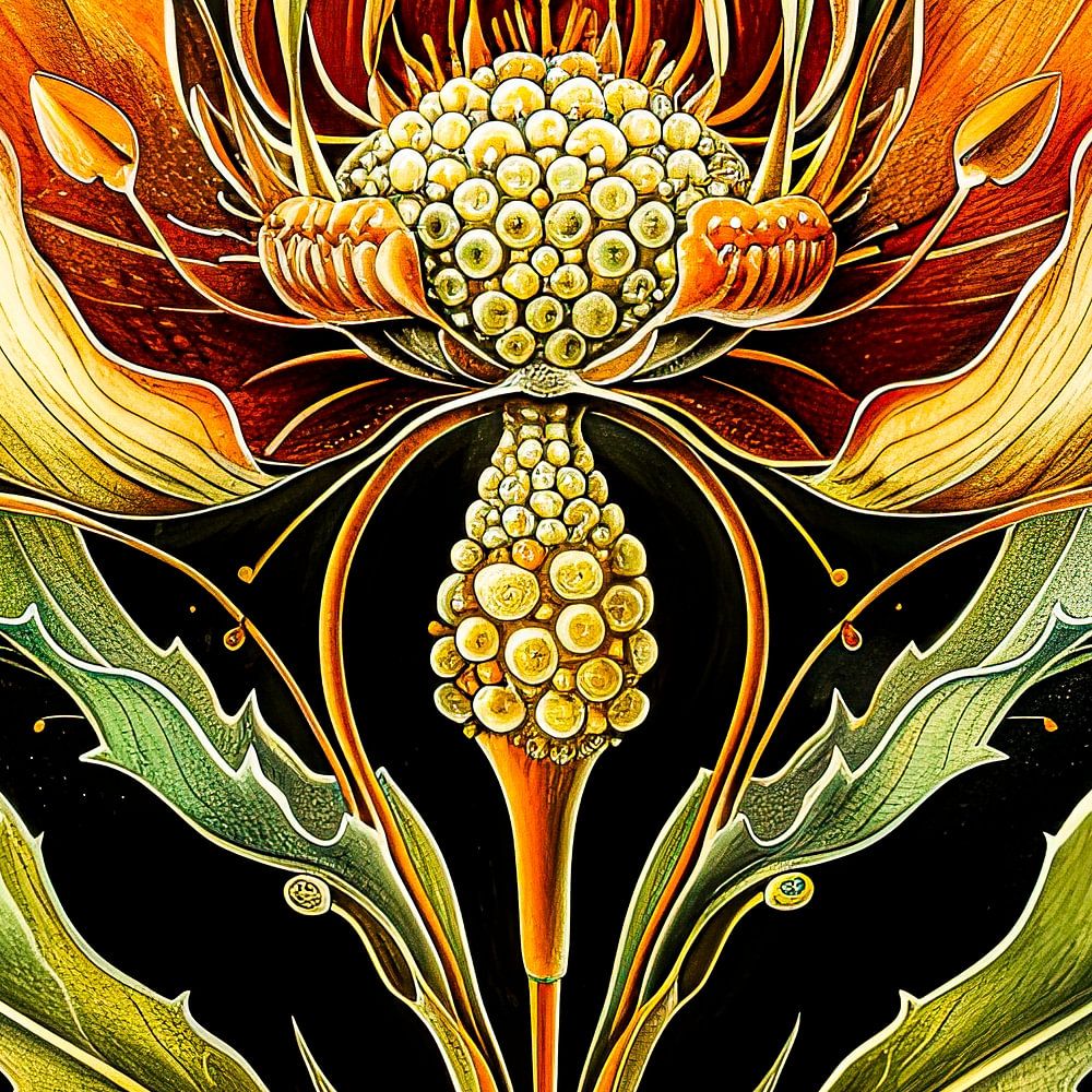 Dieses Wandgemälde zeigt eine florale Komposition im Jugendstil, die sich durch fließende Linien, organische Formen und einen starken Sinn für dekorative Symmetrie auszeichnet. Die Blütenblätter und dekorativen Elemente sind anmutig ausgebreitet, wobei sowohl auf Details als auch auf Harmonie im Design geachtet wurde. Die Farbschemata und Muster wurden sorgfältig ausgewählt, um ein ästhetisch ansprechendes und zeitloses Kunstwerk zu schaffen. Dieses Stück ist ideal für Innenräume, die einen Hauch von historischer Kunstbewegung vermitteln wollen, wobei der Schwerpunkt auf natürlichen Formen und eleganten Designs liegt. Das Stück kann als zentrales Dekorationselement dienen, das dem Raum sowohl Stil als auch Raffinesse verleiht.