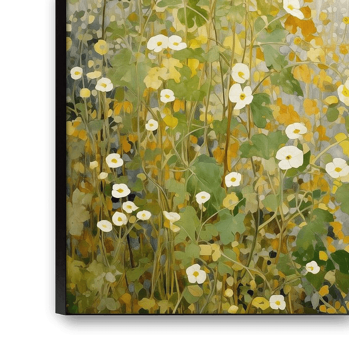 Ein farbenfrohes digitales Gemälde eines wilden, eleganten Waldes mit weißen Blumen. Das Werk verleiht Ihrem Interieur einen warmen und klassischen Look!