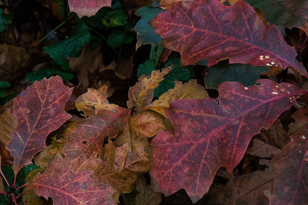 Diese Setzlinge der amerikanischen Eiche wurden von oben fotografiert. Sie haben schöne Herbstfarben und die Maserung ist gut zu erkennen.