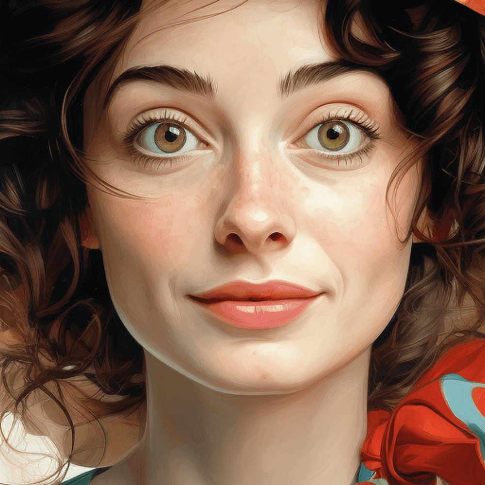 Dieses charmante Porträt im hyperrealistischen Stil zeigt eine Frau mit einem freundlichen, offenen Blick. Ihr Gesicht wird von einem großen, farbenfrohen Hut eingerahmt, dessen Oberfläche wie ein Patchwork aus leuchtendem Rot, Gelb, Blau und Grün gestaltet ist. Der Hut ist mit einem langen, leuchtend roten Band am Hals gebunden.