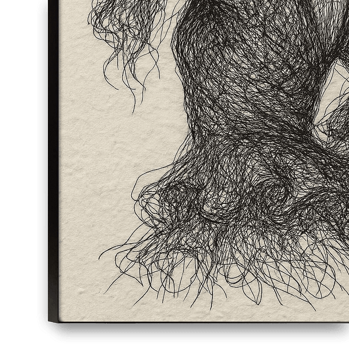 Das Porträt ist aus vielen losen schwarzen Fäden…