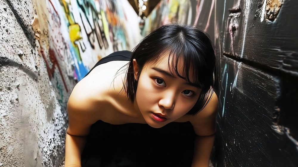 Eine junge asiatische Frau kriecht durch eine schmale Gasse, die von bunten Graffiti bedeckt ist. Die Szene fängt das Gefühl von urbaner Entdeckung und künstlerischer Ausdruckskraft ein, mit starken visuellen Kontrasten und einer intensiven Atmosphäre.