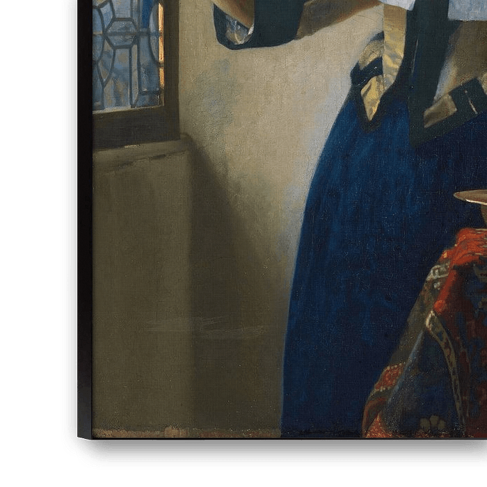 Die Szene ist eine Studie über die Ruhe, das Gleichgewicht und die Schönheit des täglichen Lebens. Vermeers unvergleichliche Beherrschung von Licht und Schatten kommt hier voll zur Geltung. Die verschiedenen Oberflächen - das schimmernde Metall des Kruges, das frische Leinen der Frisur der Frau und der schwere Stoff ihres Kleides - werden spürbar strukturiert. Die Komposition ist sorgfältig aufgebaut, mit geometrischen Formen und einer begrenzten, harmonischen Farbpalette von Blau-, Gelb- und Weißtönen, die ein Gefühl von Ordnung und Ruhe vermitteln.