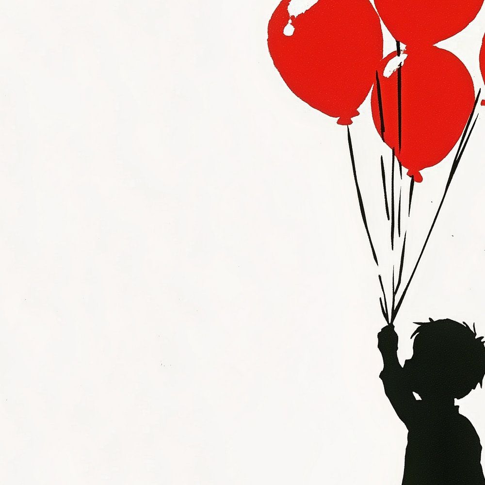 Digitales Kunstwerk, das die Silhouette eines Jungen mit roten Luftballons zeigt. Inspiriert von Banksy.