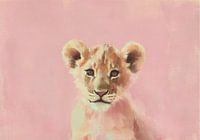 Das Gemälde zeigt ein junges Löwenjunges vor einem einfarbig rosafarbenen Hintergrund. Der kleine Löwe blickt direkt nach vorn, der Kopf leicht nach links geneigt. Das Fell ist hell goldbraun mit sanften Tonabstufungen, die Struktur und Tiefe erzeugen. Dunkelbraune, mandelförmige Augen und eine kleine dunkelbraune Nase prägen den…