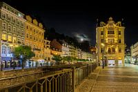 Der berühmteste böhmische Kurort, dessen Bedeutung weit über die Landesgrenzen reicht, liegt im westlichsten Teil Tschechiens, im reizvollen Tal des Flusses Tepl. Karlsbad verfügt über hübsche Promenaden, prächtige Häuser, zauberhafte Kurkolonnaden und belebende Heilquellen. Idyllische Nachtaufnahme bei Vollmond vom Ufer der Tepl.