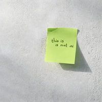 Op dit werk zie je een eenvoudige sticky note op een witte, licht ruwe muur. De muur heeft een subtiele structuur en kleine imperfecties die zorgen voor een realistische uitstraling. De sticky note is licht gekruld aan de bovenkant, waardoor er een zachte schaduw ontstaat.