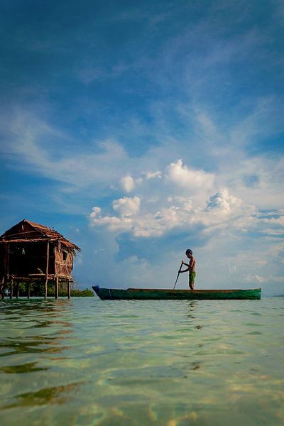 "A powerful testament to the resilience of the Bajau people. 'Little Fighter' depicts a young sea nomad expertly navigating his small dugout canoe across the shallow, crystalline waters of his ancestral home. Against a backdrop of a traditional stilt house and a vast, dramatic sky, this image captures the early bond…