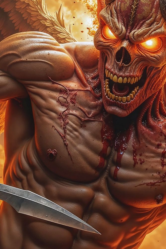 Ein Dämon des Feuers erhebt sich aus einem gleißenden Inferno, während Funken wie verdammte Seelen durch die Luft treiben. Sein Dolch glänzt im Glutlicht ewiger Verdammnis, seine Hörner und Flügel lodern in einer Glorie, die alles verschlingt, was Leben wagt. Dieses Werk zeigt den Dämon nicht als Symbol des Bösen allein, sondern als Verkörperung unaufhaltsamer Gewalt – inspiriert von mythologischen Abgründen und apokalyptischen Filmvisionen.