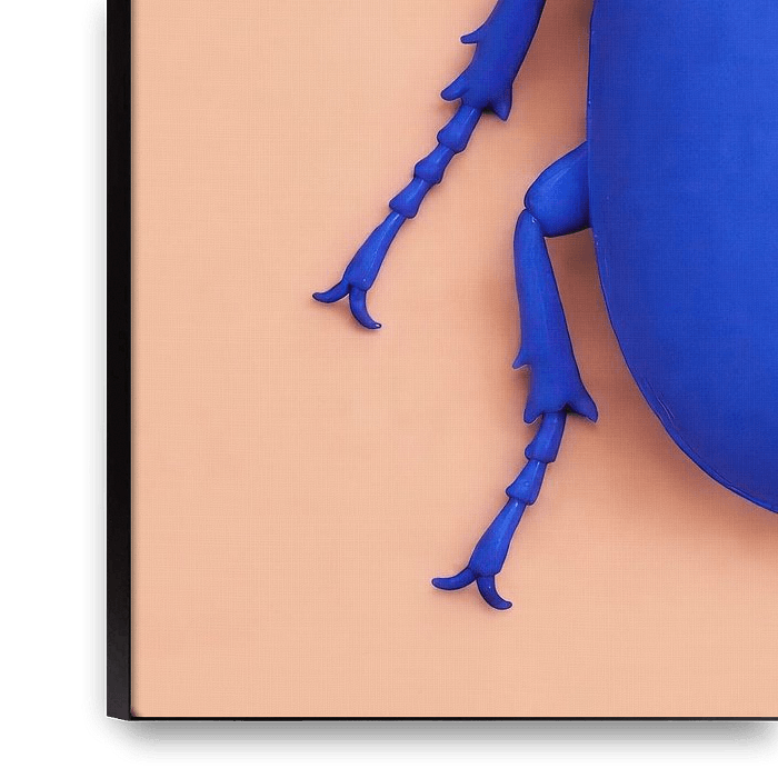 Auf diesem Werk sieht man einen kobaltblauen Käfer, streng symmetrisch und fast ikonisch in seiner Form, vor einem pfirsichfarbenen Hintergrund. Die Haltung des Käfers erinnert an klassische Insektenpräparate, aber das glänzende, gegossene Plastik verleiht dem Bild einen modernen, fast pop-art-artigen Charakter.