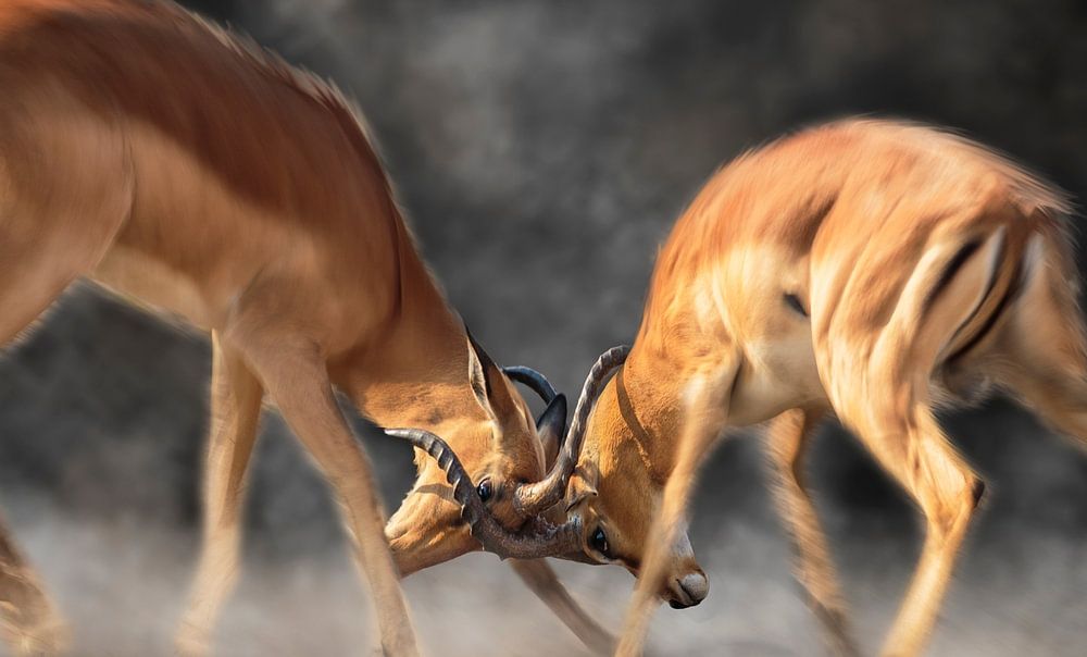 Dieses Werk zeigt zwei Impala-Böcke (Aepyceros melampus), die während der Paarungszeit um die Gunst der Weibchen kämpfen. Der Hintergrund ist dunkel, fast schwarz, so dass die beiden Tiere gut zur Geltung kommen. Der Kampf wirbelt Staubwolken auf und erzeugt eine dramatische Dynamik. Das Bild kann die ursprünglichen Kräfte symbolisieren, die am Kampf um die Existenz in der Natur beteiligt sind.