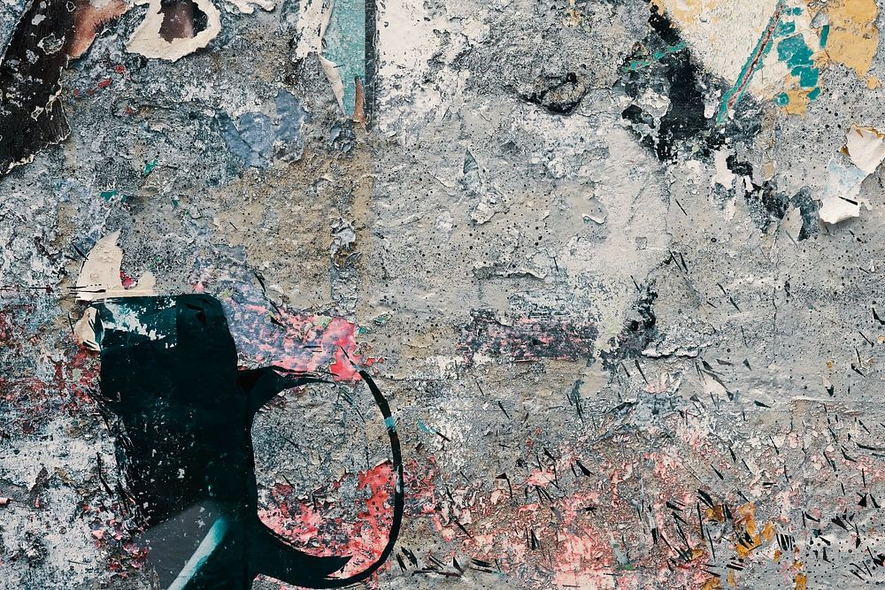 Unter abblätternden Schichten von Papier und Plakaten im urbanen Raum erscheint eine betonähnliche Oberfläche. Mehrere solcher Bilder und eine Papiercollage fügen sich in dieser digitalen Collage mit Fokus auf einer Kaffeetasse zusammen. Die Wörter „Now“ und „Yes“ sind ebenfalls zu sehen.