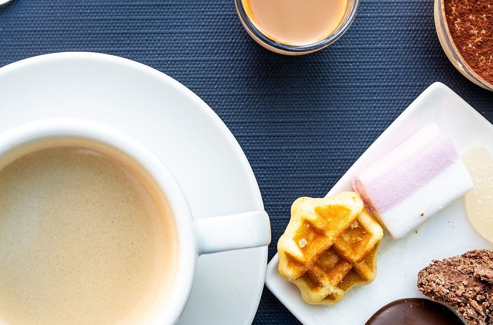 Eine überwältigende Auswahl an Süßigkeiten wie Waffeln, Schokolade, Tiramisu und ein kleiner Likör, begleitet von einem klassischen Kaffee.