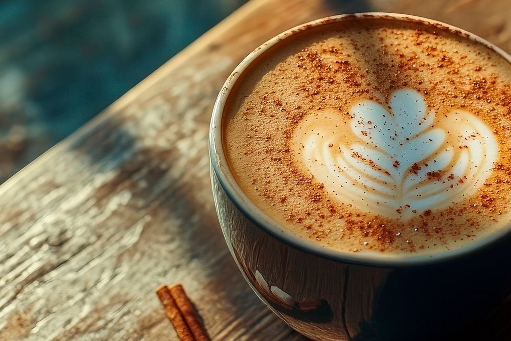 Ein dampfender Kaffeebecher ruht auf einer rustikalen Holztischoberfläche, umgeben von der sanften Lichtmagie eines Fensterplatzes. Die kunstvoll verzierte Milchschaumoberfläche und die warmen Farbtöne vermitteln ein Gefühl von Gemütlichkeit und Entspannung. Ideal für die Küche oder ein behagliches Wohnzimmer, wo der Genuss von Kaffee und gemütlichen Gesprächen im Vordergrund steht.