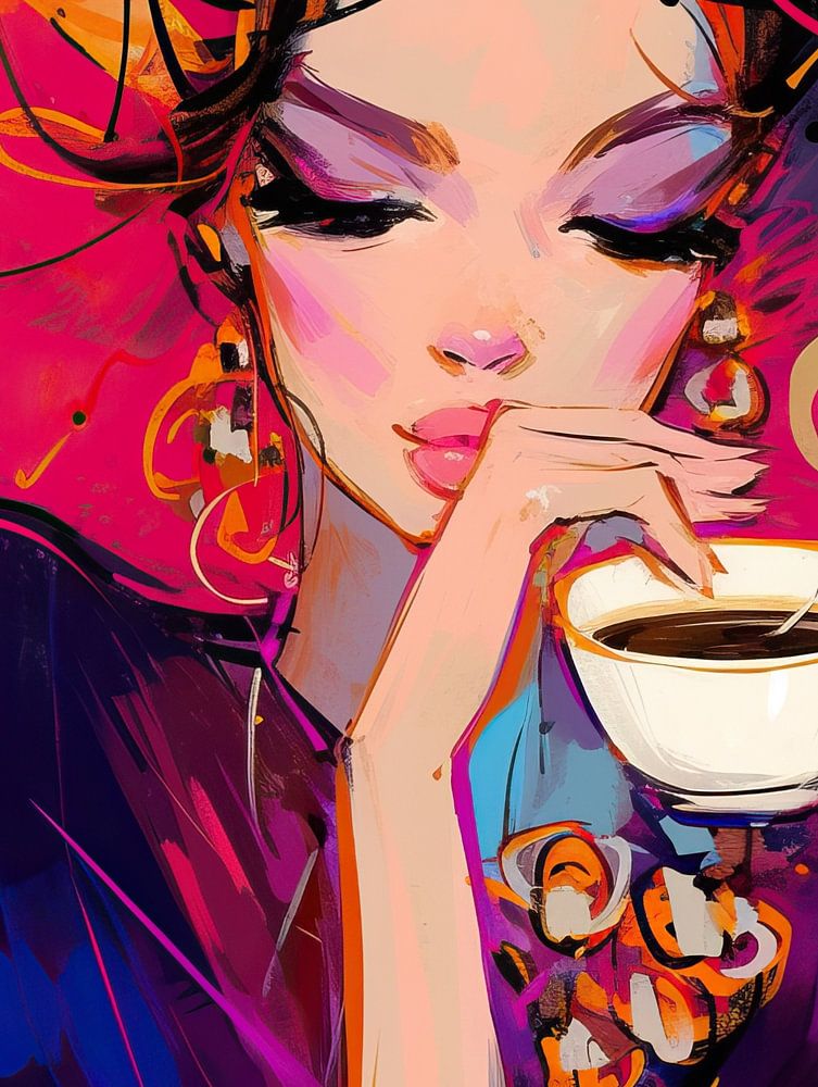 Kaffee - Dieses Frauengemälde zeigt eine elegante Dame, die eine Tasse Kaffee genießt. Es ist in einem lebhaften, modernen Stil mit hellen Farben und dynamischen Pinselstrichen ausgeführt, die ein Gefühl der Bewegung vermitteln.