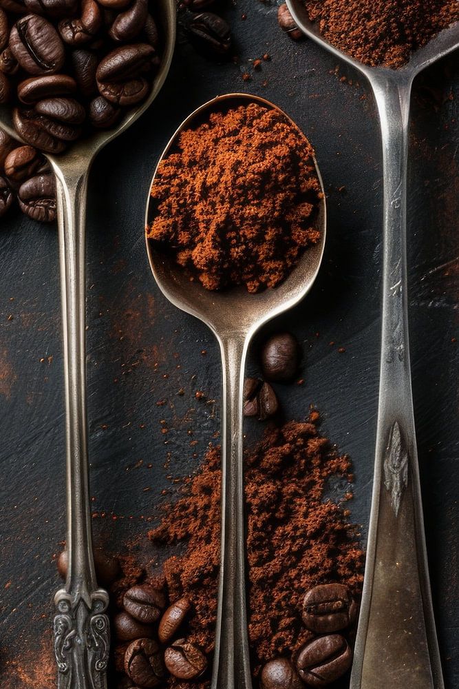 Dieses exquisite Kunstwerk zeigt drei antike Löffel, die sorgfältig Kaffeebohnen und frisch gemahlenes Kaffeepulver präsentieren. Der dunkle, rustikale Hintergrund betont die Texturen und Farben der Bohnen und des Pulvers. Perfekt für Kaffeeliebhaber und Küchen, die einen Hauch von Vintage-Flair suchen.