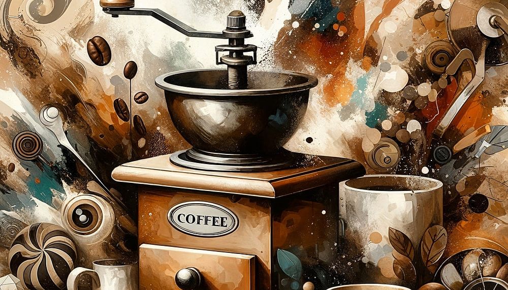 In diesem Bild ist eine alte Kaffeemühle zu sehen, aus der eine Explosion von Kaffeebohnen und kreativen Mustern entspringt, die die energiegeladene und transformative Natur der Kaffeezubereitung darstellt. Die Farbspritzer und abstrakten Formen im Hintergrund symbolisieren die vielfältigen Eindrücke, die Kaffee in uns hervorruft, und vermitteln das Gefühl von Bewegung und Lebendigkeit. Der rustikale Holztisch und die klassische Kaffeemühle hingegen rufen eine nostalgische Erinnerung an die traditionelle Art des Kaffeemahlens hervor. Das Bild kombiniert Elemente des Althergebrachten mit moderner Kunst und spiegelt die zeitlose Verbindung zwischen Vergangenheit und Gegenwart wider.