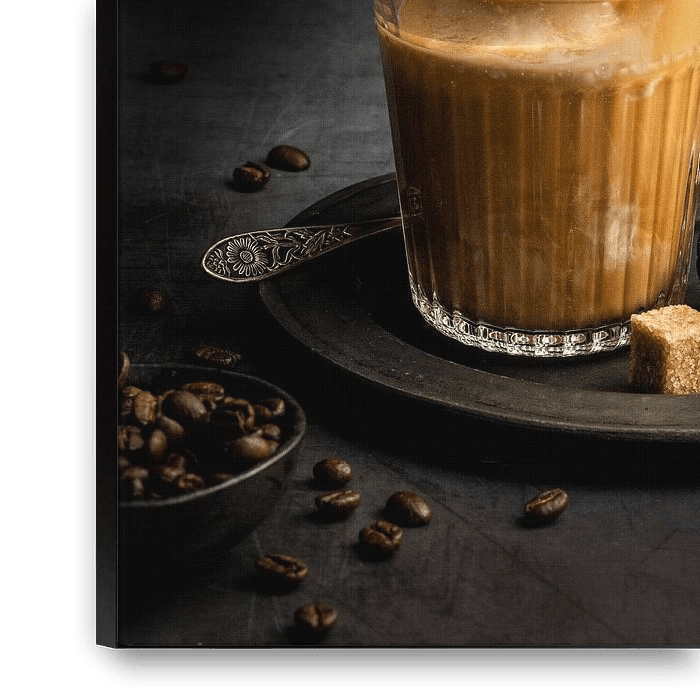 Bekommen Sie schon Lust auf Kaffee? Ein dynamisches Bild von fallenden Zuckerwürfeln in einem Glas Kaffee, das mit Oreo-Keksen und Kaffeebohnen gestaltet ist. Sieht toll aus in einem Restaurant, Café oder an der Küchenwand.