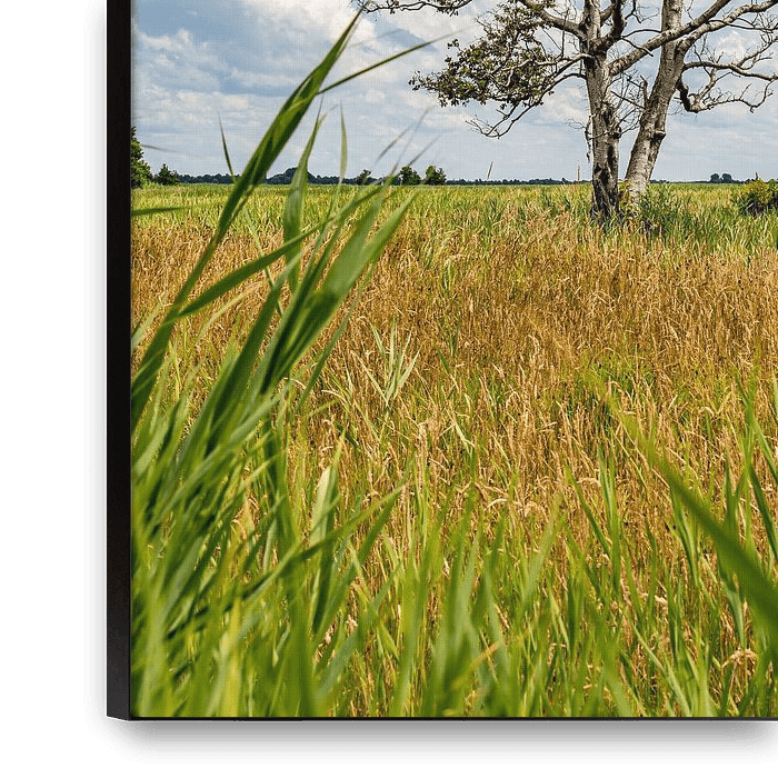 Buntes Landschaftsfoto eines fast kahlen Baumes inmitten eines Naturschutzgebietes. Die Wolken und der blaue Himmel machen es zu einem eindrucksvollen Foto. Das unscharfe Gras im Vordergrund verleiht dem Foto mehr Tiefe. Der Baum wurde völlig scharf fotografiert. Das Foto wurde in den Weerribben in den Niederlanden aufgenommen. Die…