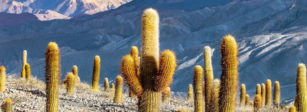 Riesige Kakteen hoch in den Anden auf der Ruta 51 von Salta in Argentinien nach Chile im Licht des späten Nachmittags.