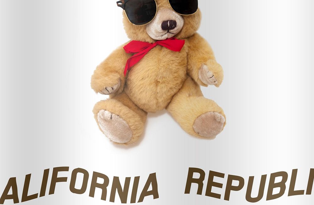 Digitales Kompositum - Humorvolle kalifornische Flagge mit einem Teddybär, der coole Sonnenbrillen trägt.