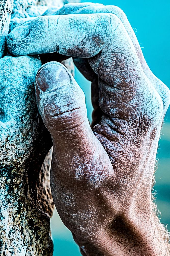 Eine beeindruckende Nahaufnahme der mit Kreide bedeckten Hand eines Bergsteigers, die sich fest an eine raue Felswand klammert. Dieses Design strahlt Stärke, Entschlossenheit und die Schönheit der Natur aus. Die leuchtenden Details und die sanften Blautöne schaffen ein dynamisches visuelles Erlebnis, perfekt für Liebhaber von Abenteuern und Outdoor-Aktivitäten. Ideal für moderne Innenräume, Büros oder als inspirierendes Geschenk für Sportfans.