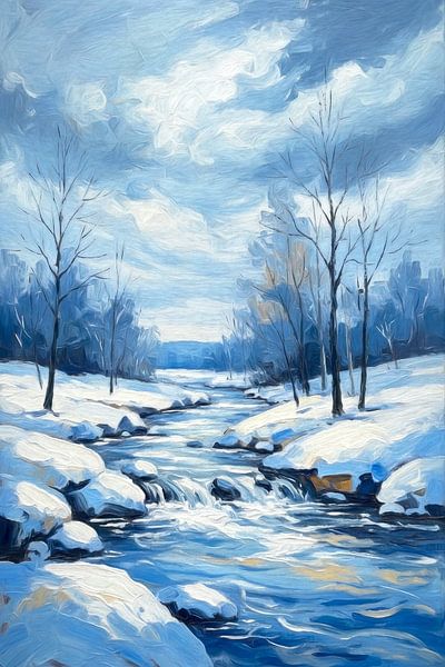 Eine friedliche Winterszene zeigt einen fließenden Fluss, dessen Ufer von schneebedeckten Schneefeldern gesäumt sind. Kahle Bäume heben sich vom bedeckten Himmel ab und verstärken die winterliche Atmosphäre.