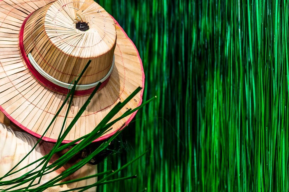 Das Bild strahlt eine tiefe Ruhe und Hingabe aus, wobei die warmen Farbtöne ihrer traditionellen Kleidung und ihres Weidenhuts einen schönen Kontrast zum intensiven Grün des trocknenden Grases bilden. Diese Szene erzählt die Geschichte einer Kultur, in der das Kunsthandwerk noch eine zentrale Rolle im täglichen Leben spielt und in der jede Matte ein einzigartiges Kunstwerk ist, das aus natürlichen Materialien und altem Wissen hergestellt wird.