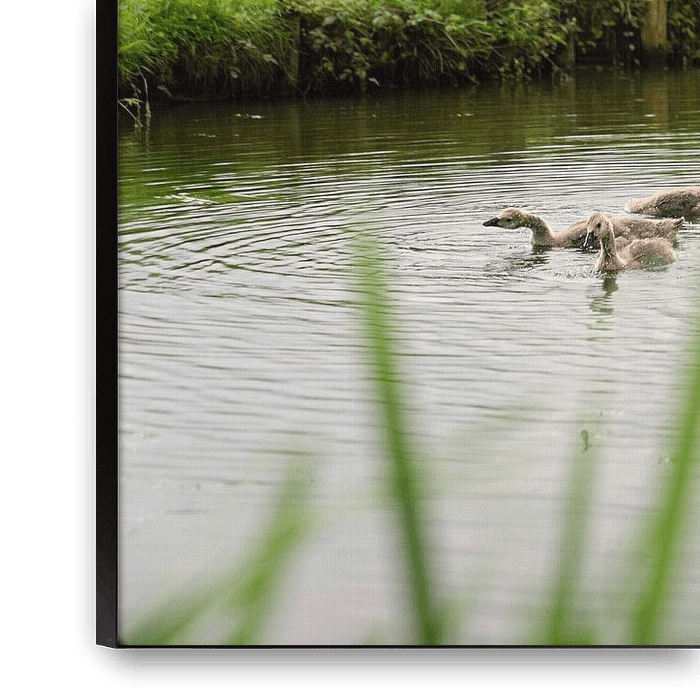 Bestelle dieses Landschafts-Wandbild Kanadagänse mit Küken im Teich von Simon Peeters als Reproduktion auf Leinwand, Alu-Dibond, als Poster, Fototapete oder Acrylglasbild.
