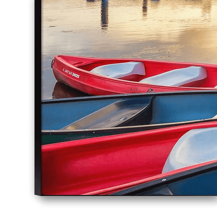Rote Kanus im Hafen von Hardenberg bei Sonnenuntergang