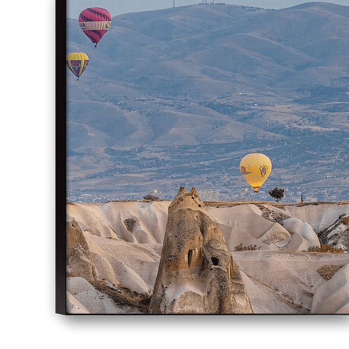 Das Bild zeigt die atemberaubende Landschaft Kappadokiens, die bekannt ist für ihre bizarren Tuffsteinformationen und farbenprächtigen Felder. In der Morgendämmerung erheben sich elegant bunte Heißluftballons in den strahlend blauen Himmel, während die warmen Farben der aufgehenden Sonne die Szenerie in ein magisches Licht tauchen. Die sanften Hügel und die einzigartigen „Feenkamine“ im Hintergrund verleihen dem Bild eine traumhafte Atmosphäre, die den Betrachter in die malerische Schönheit dieser faszinierenden Region eintauchen lässt.