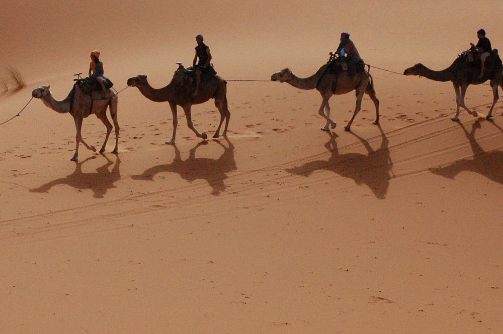 Eine Kamelkarawane in der Wüste Erg Chebbi in Marokko