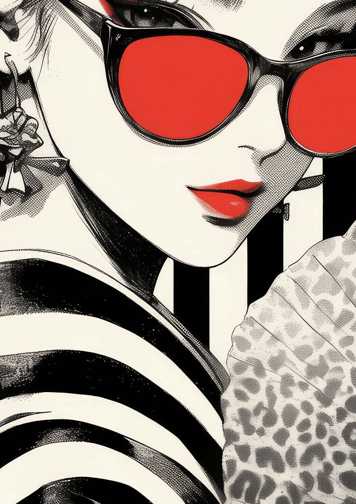 Diese Schwarz-Weiß-Illustration ist eine auffällige Mischung aus moderner Eleganz und traditioneller Schönheit, die mit kräftigem Rot akzentuiert ist und eine geheimnisvolle und kraftvolle Präsenz ausstrahlt.