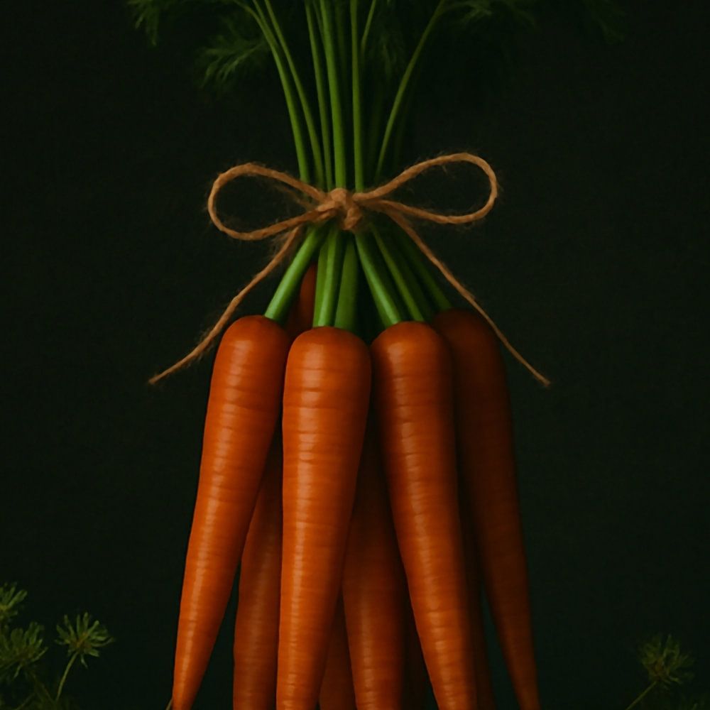Ein überraschend eleganter Karottenstrauß, kunstvoll zusammengebunden und vor einem dunklen Hintergrund stilisiert. Minimalistisch, mit einem Hauch von Humor für den Liebhaber kulinarischer Kunst.