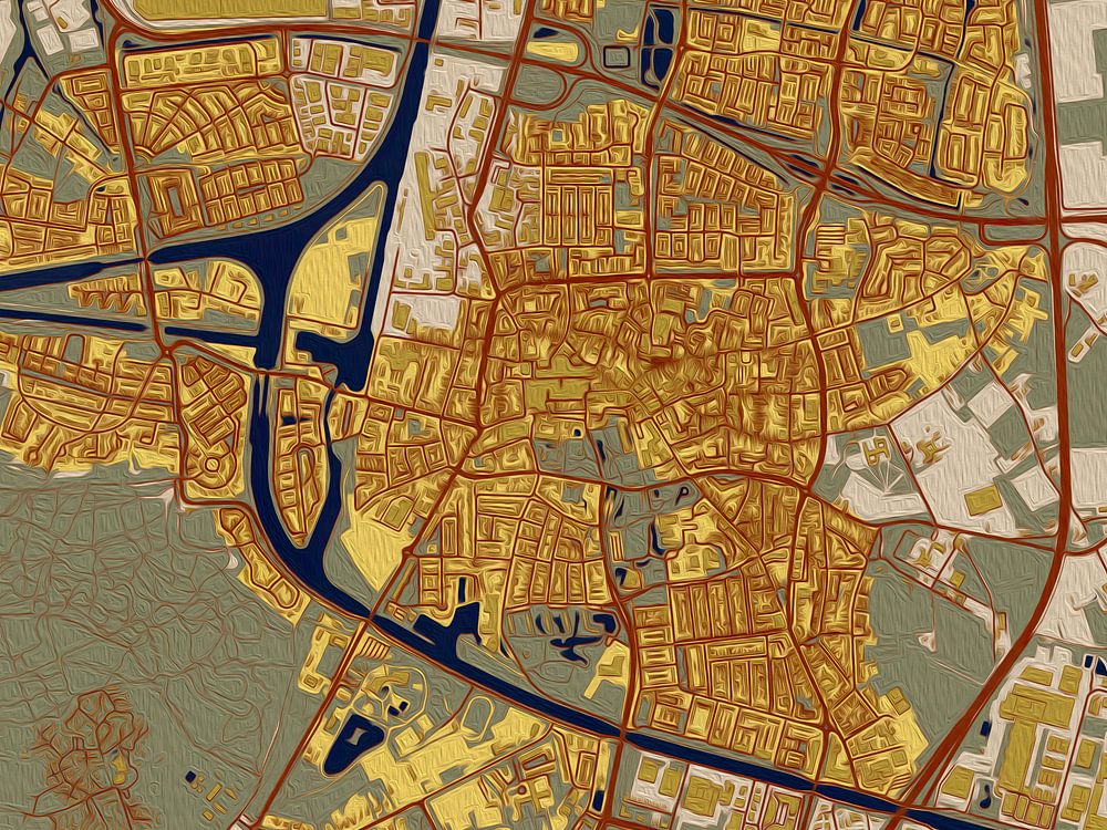 Diese Karte von Oosterhout ist von der Farbpalette des Gemäldes "Der Kuss" von Gustav Klimt inspiriert. Die dunkelblauen und orangefarbenen Töne verleihen dieser Karte aus Oosterhout einen Art-Deco-Look.