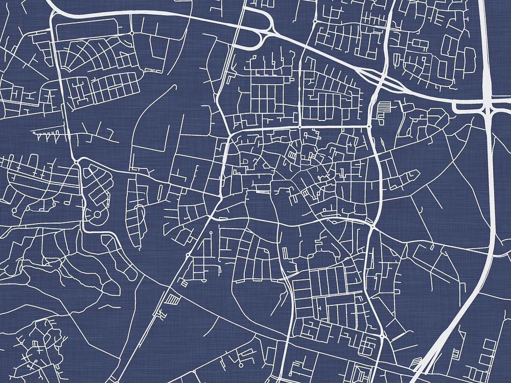 Erkunden Sie Oosterhout mit dieser Karte im Royal Blue-Stil. Die weißen Straßen setzen sich kontrastreich gegen einen tiefblauen Hintergrund ab. In Kombination mit einer subtilen Leinentextur verleiht diese Karte jedem Raum, in dem sie aufgehängt wird, eine Note von Raffinesse und Ruhe.