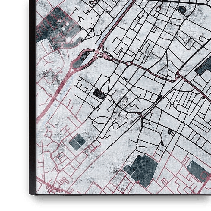 Diese Karte von Roubaix trägt unseren maßgeschneiderten Stil „White Winter“. Die dunkelroten Straßen ziehen sich wie eine warme Arterie durch die kalte Winterlandschaft. Ein dicker weißer Schnee bedeckt die Felder und die Stadt, während die Vegetation ihre Blätter verloren hat und sich im Dunkeln auf den Frühling vorbereitet. Diese…