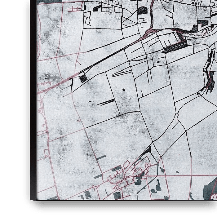 Diese Karte von Weimar trägt unseren maßgeschneiderten Stil „White Winter“. Die dunkelroten Straßen ziehen sich wie eine warme Arterie durch die kalte Winterlandschaft. Ein dicker weißer Schnee bedeckt die Felder und die Stadt, während die Vegetation ihre Blätter verloren hat und sich im Dunkeln auf den Frühling vorbereitet. Diese…