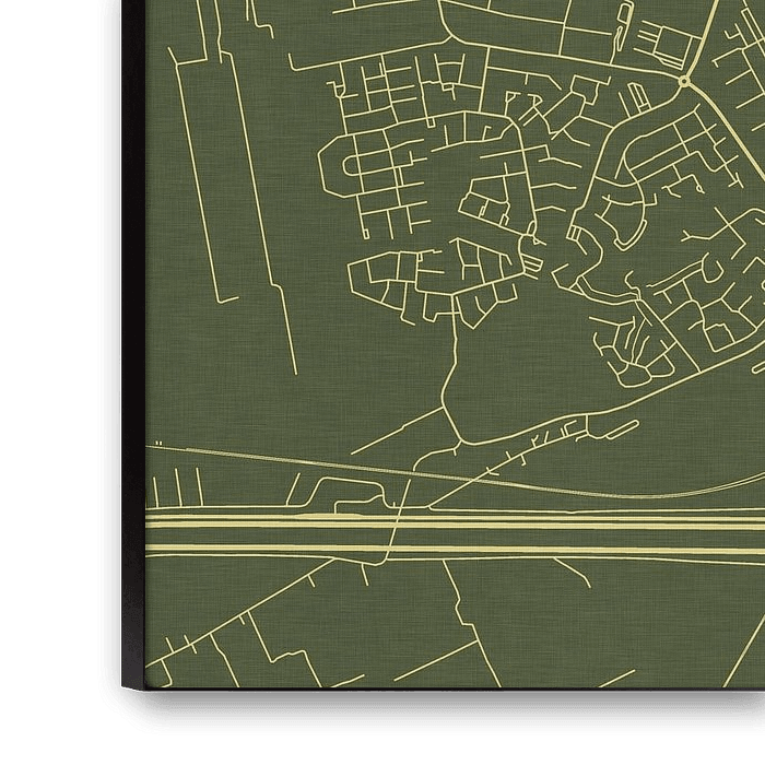 Erkunden Sie Woerden mit dieser Karte im Stil Grünes Gold. Die golden-gelben Straßen setzen sich kontrastreich gegen einen grünen Hintergrund ab. In Kombination mit einer subtilen Leinentextur verleiht diese Karte jedem Raum, in dem sie aufgehängt wird, eine Note von Raffinesse und Ruhe.