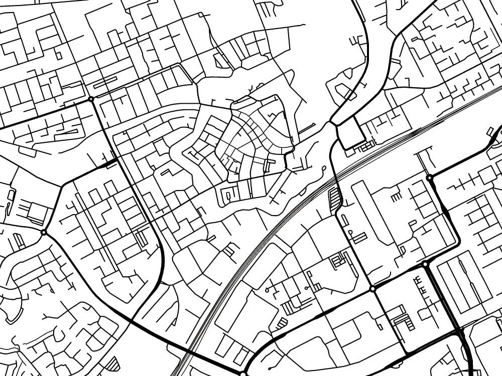Die Karte von Woerden mit weißem Hintergrund und schwarzen Straßen.
