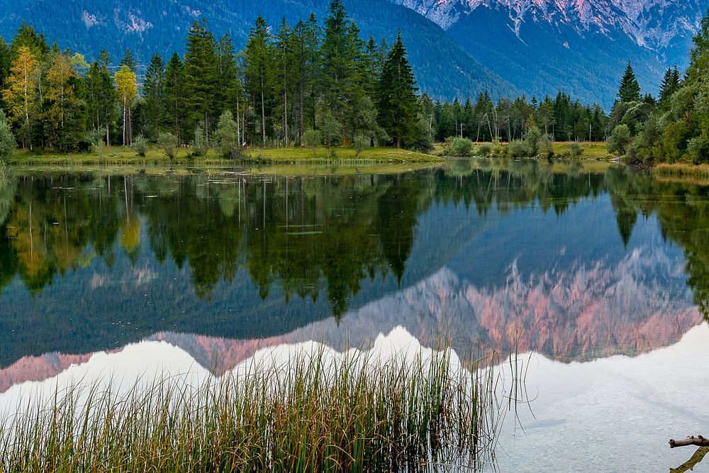 Das Karwendelgebirge im Hintergrund von einem See. Aufgenommen kurz vor Sonnenuntergang