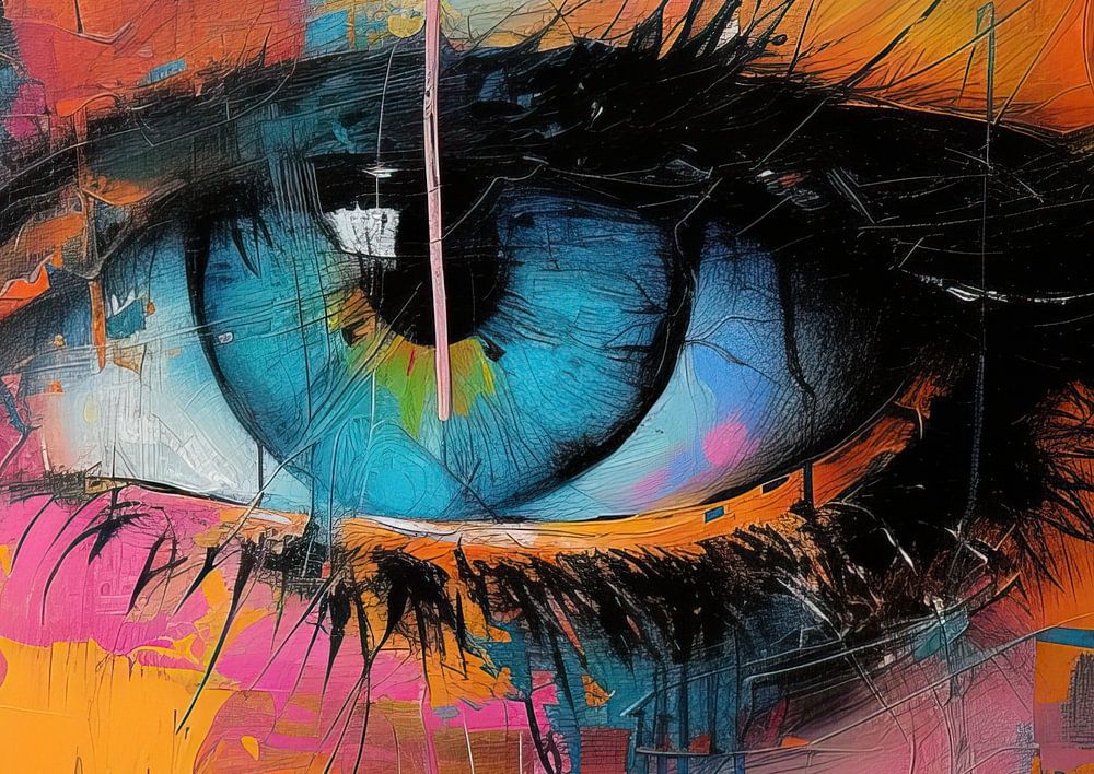 Details: Auge, bunt, abstrakt, modern, ausdrucksstark, Malerei, neongelb, neonorange, neonpink, schwarz