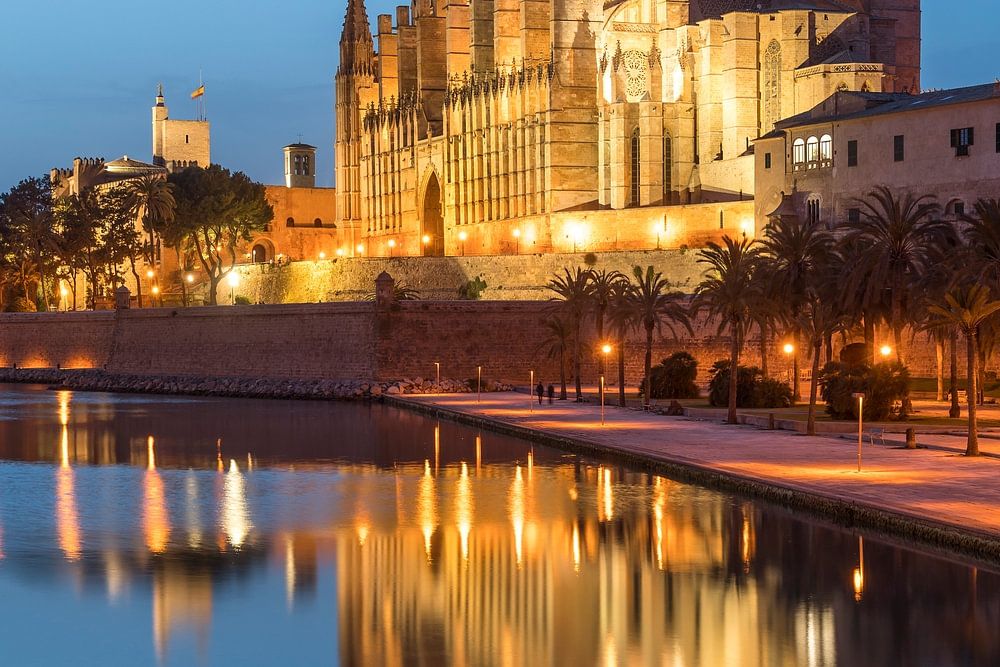 Kathedrale La Seu in der Abenddämmerung, Palma de Mallorca, Mallorca, Balearen, Spanien | Cathedral La Seu at dusk, Palma de Mallorca, Majorca, Balearic Islands, Spain,